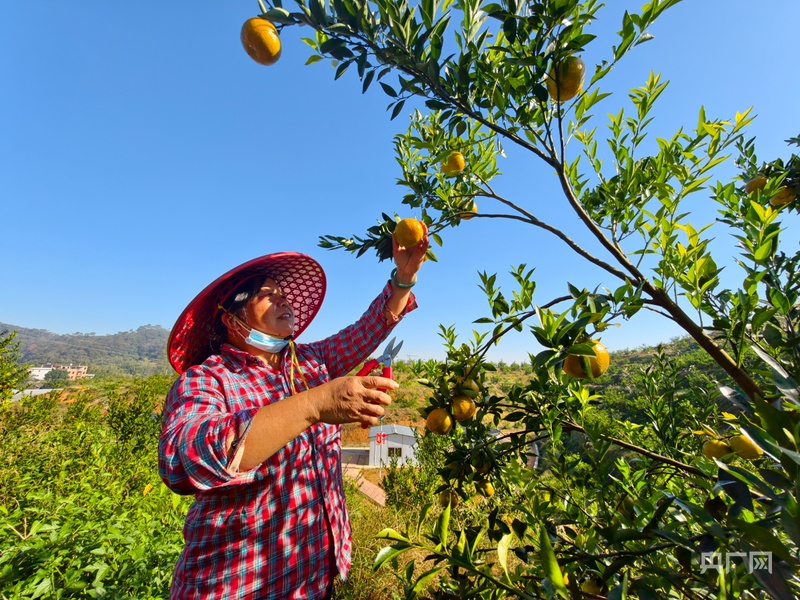 农户手持果剪,在柑树下采摘成熟果实(央广网见习记者 滕艳娇 摄)