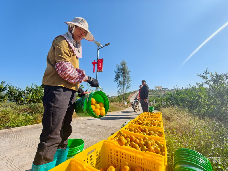 央广网钦州11月30日消息(记者梁瑜琳 见习记者滕艳娇)11月下旬,广西浦北县三合镇千亩大红柑种植示范基地采收正忙,青红果实缀满丘陵柑树。