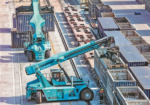 1月8日,南宁国际铁路港集装箱吊运作业一派繁忙。近年来,国铁南宁局推广集装箱“负面清单”管理,目前班列运输产品品名扩展至1.1万余个,基本涵盖适箱货源。(记者周军 摄)
