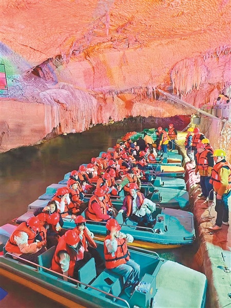 二月二十七日,游客在国家4A级旅游景区桂林丰鱼岩乘舟游览暗河景观。春节假期后,桂林市旅游热度不减,错峰游客纷至沓来,文旅市场持续升温。(周俊远 摄)