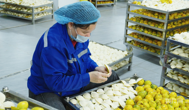 鲜果离开果园,即刻进入精细化加工环节。广西中皮健康产业有限公司的加工车间内,鲜果经清洗、剥皮、晾晒后,按品相精准分流,完好果做茶饮,中等果加工饮料原料,余料作食品添加剂,实现全果利用。公司4000吨产能的加工中心与3.5万平方米“陈皮金库”无缝衔接,4000吨存储量保障产品保值。