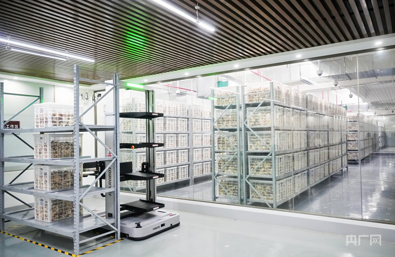 浦北陈皮智能公共仓,机器人穿梭作业,货架满载仓储筐(央广网见习记者 滕艳娇 摄)