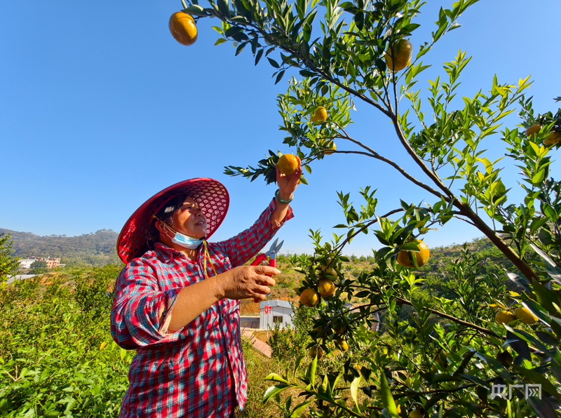 种植示范基地,农户采收首批大红柑,果实坠弯枝头(央广网见习记者 滕艳娇 摄)